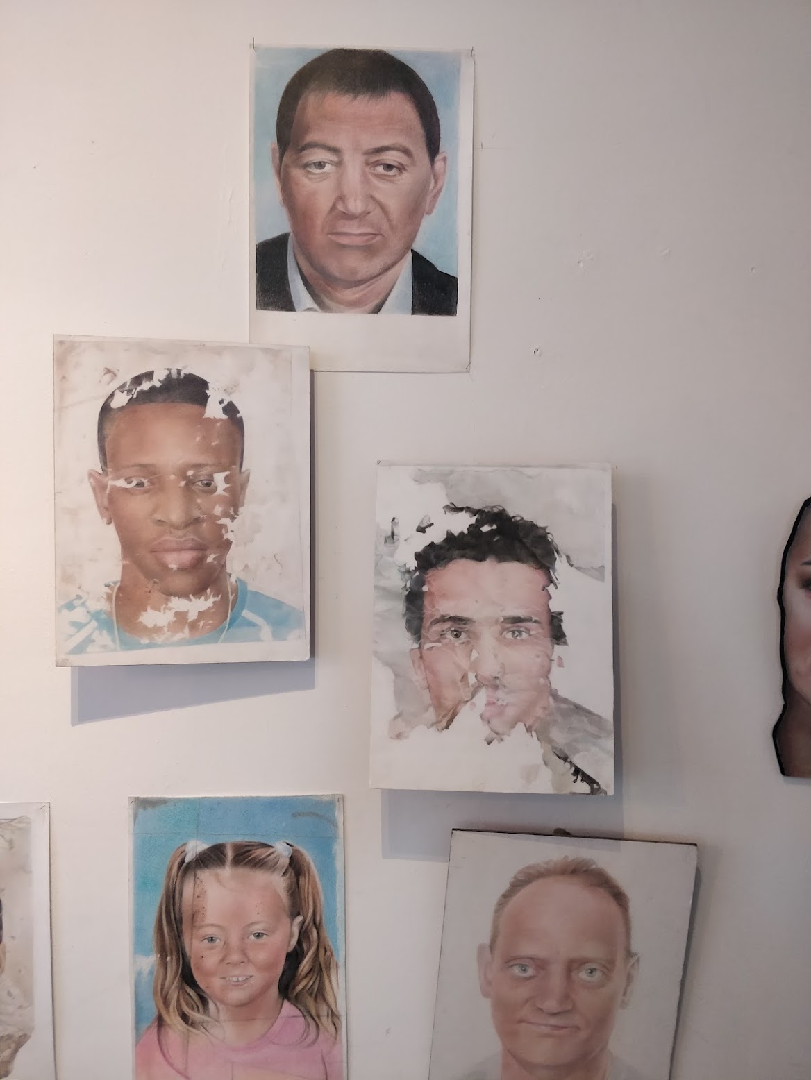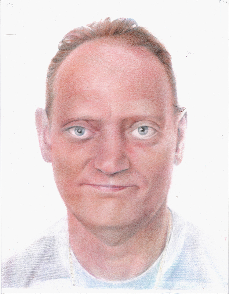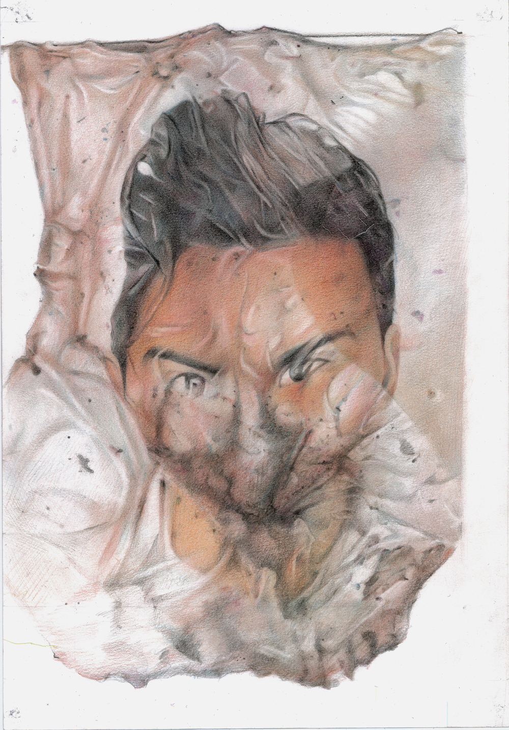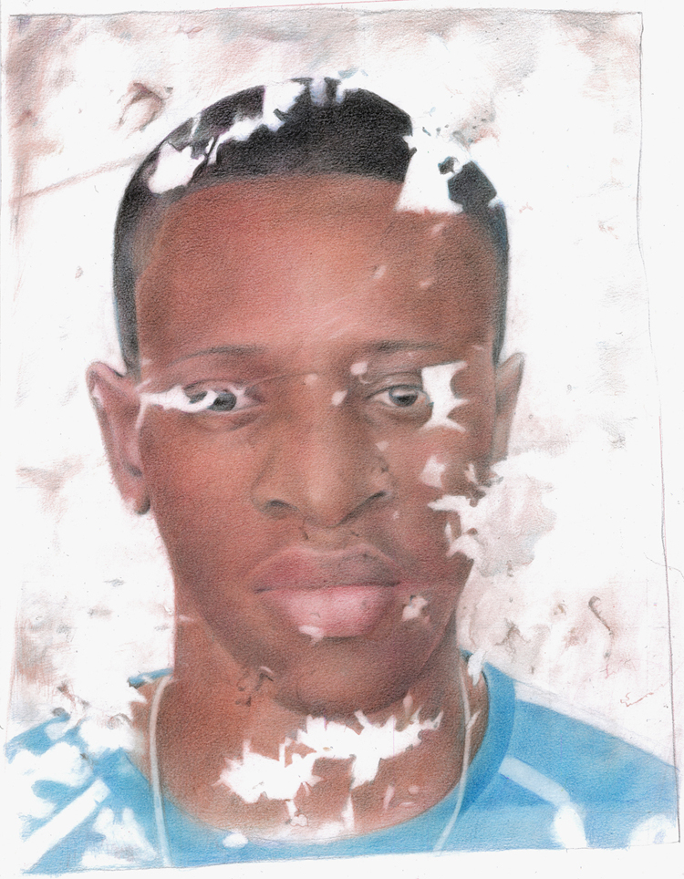 Pasfoto’s die ik op straat vindt nagetend met kleurpotlood.