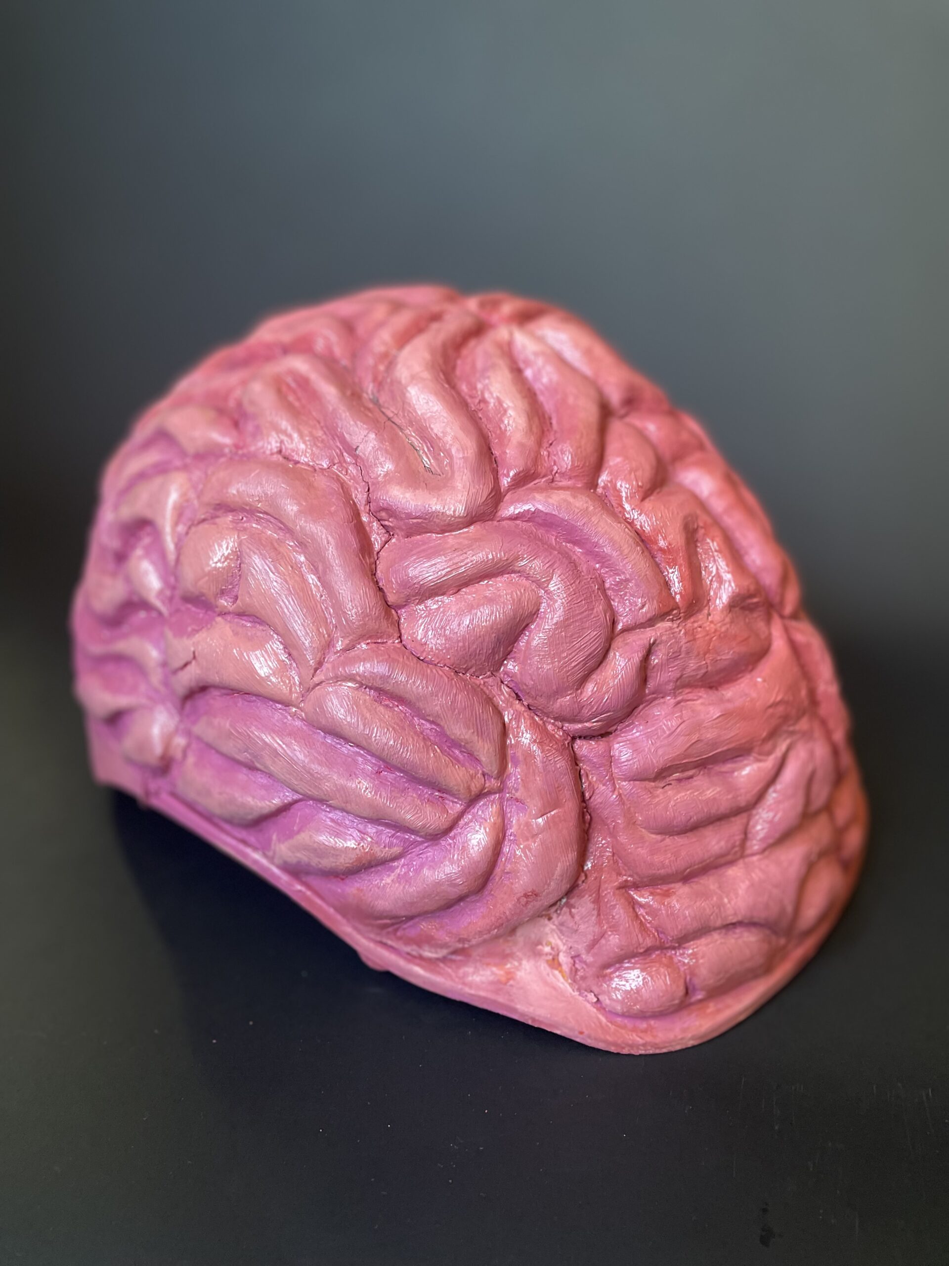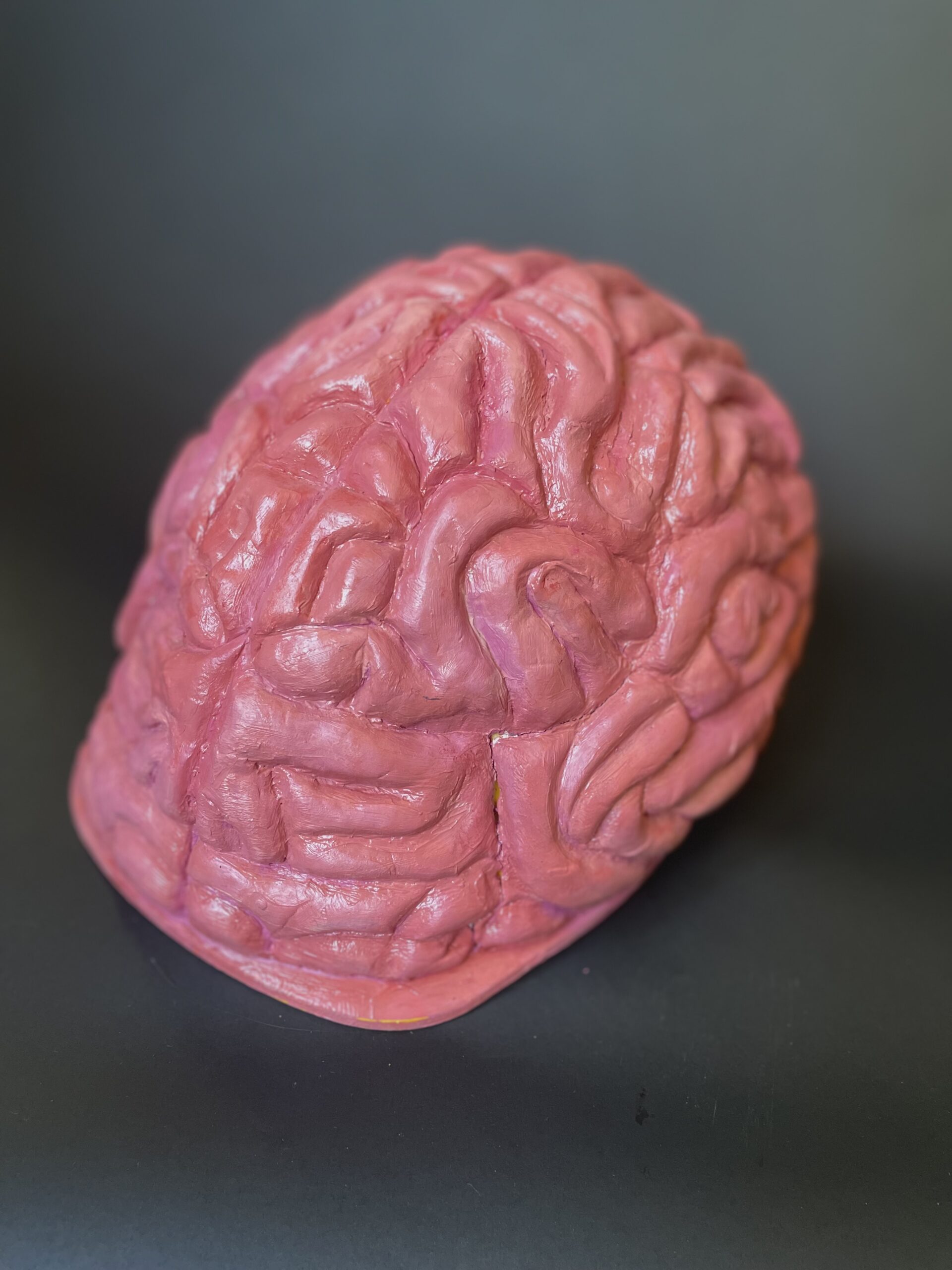 Een sculpturale helm gemaakt van keramiek en olieverf.