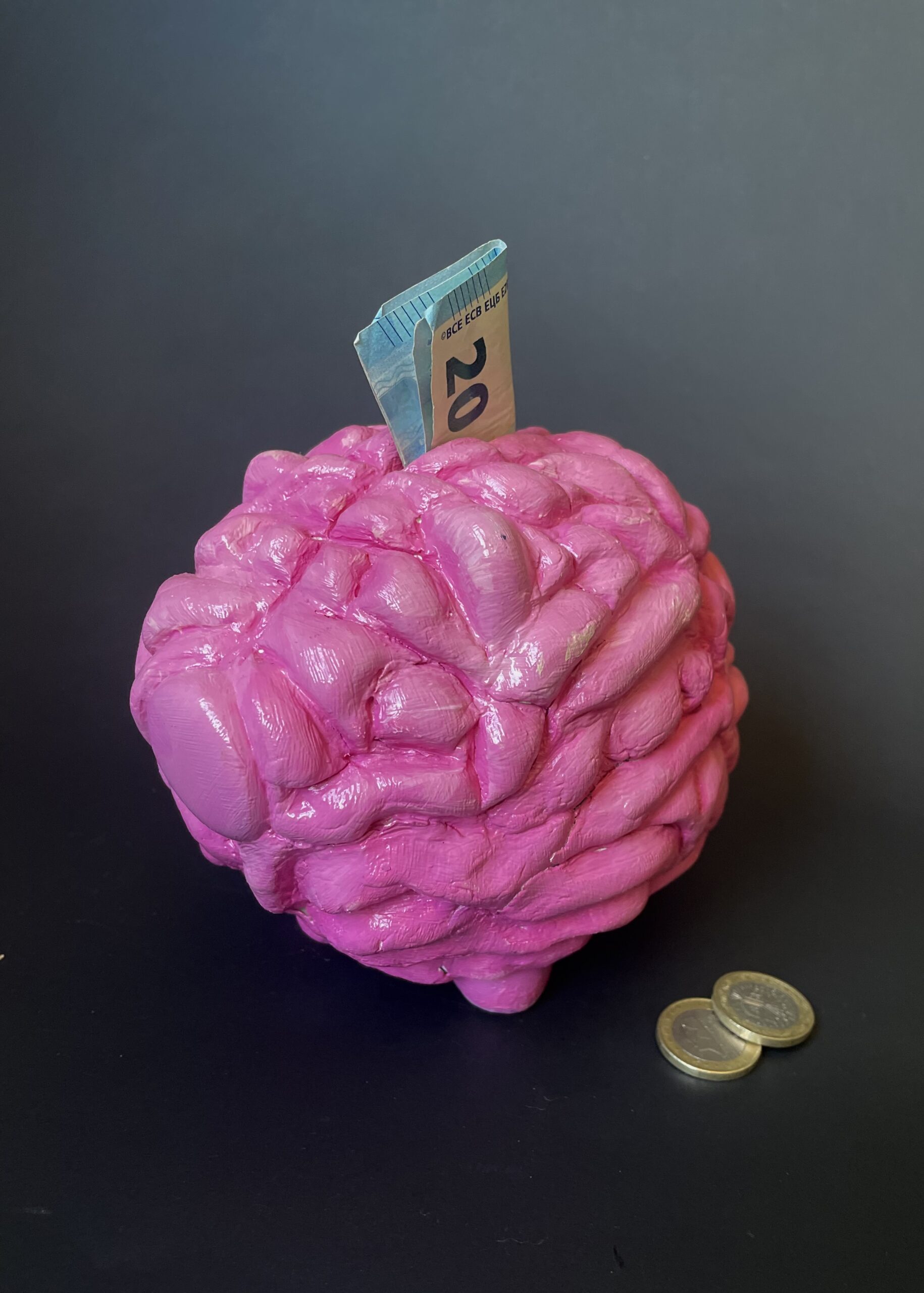 Een spaarvarken in de vorm van hersenen, die zachtjes knort bij elke storting. Gemaakt om te vullen, te vergeten, en op een dag misschien te breken.