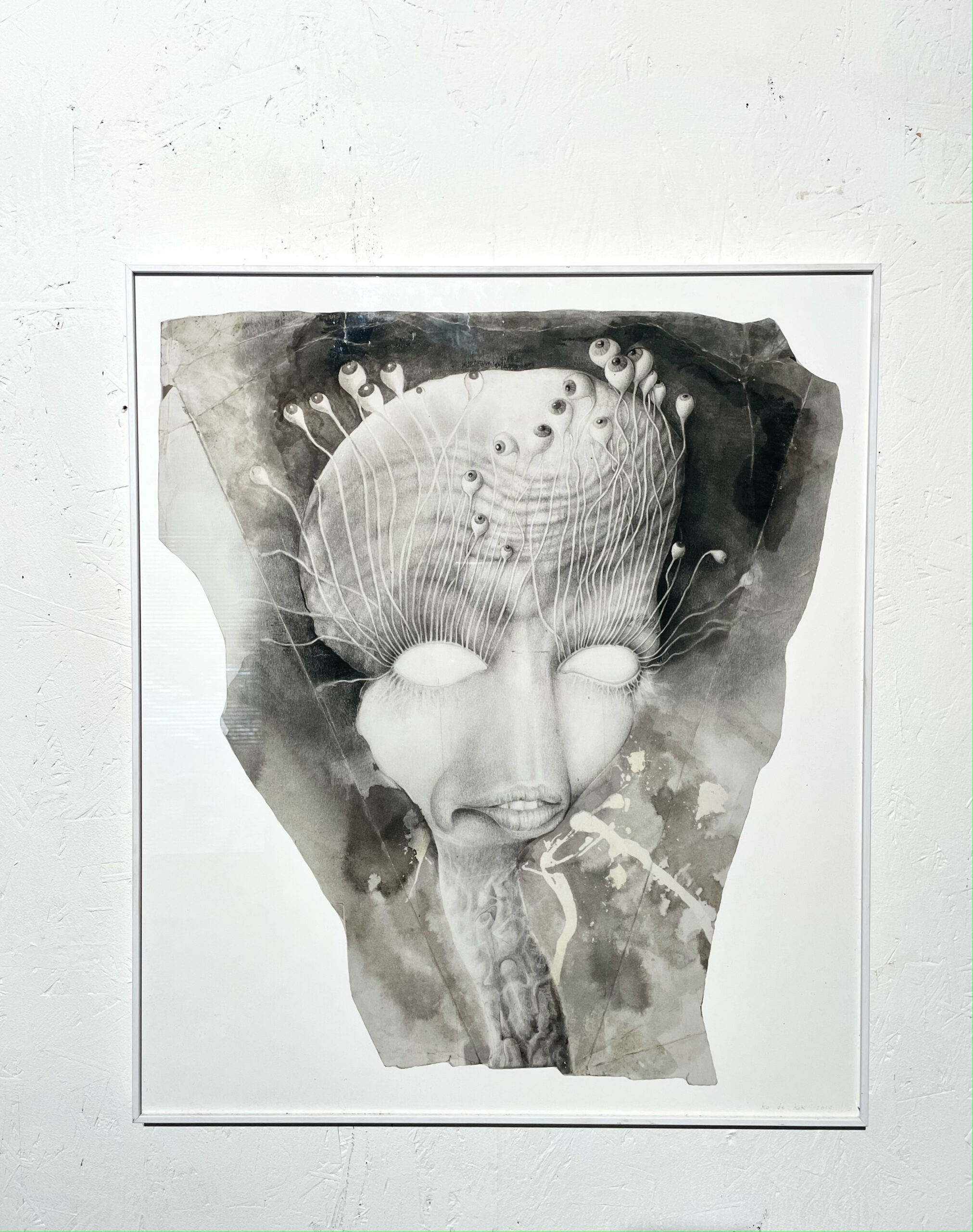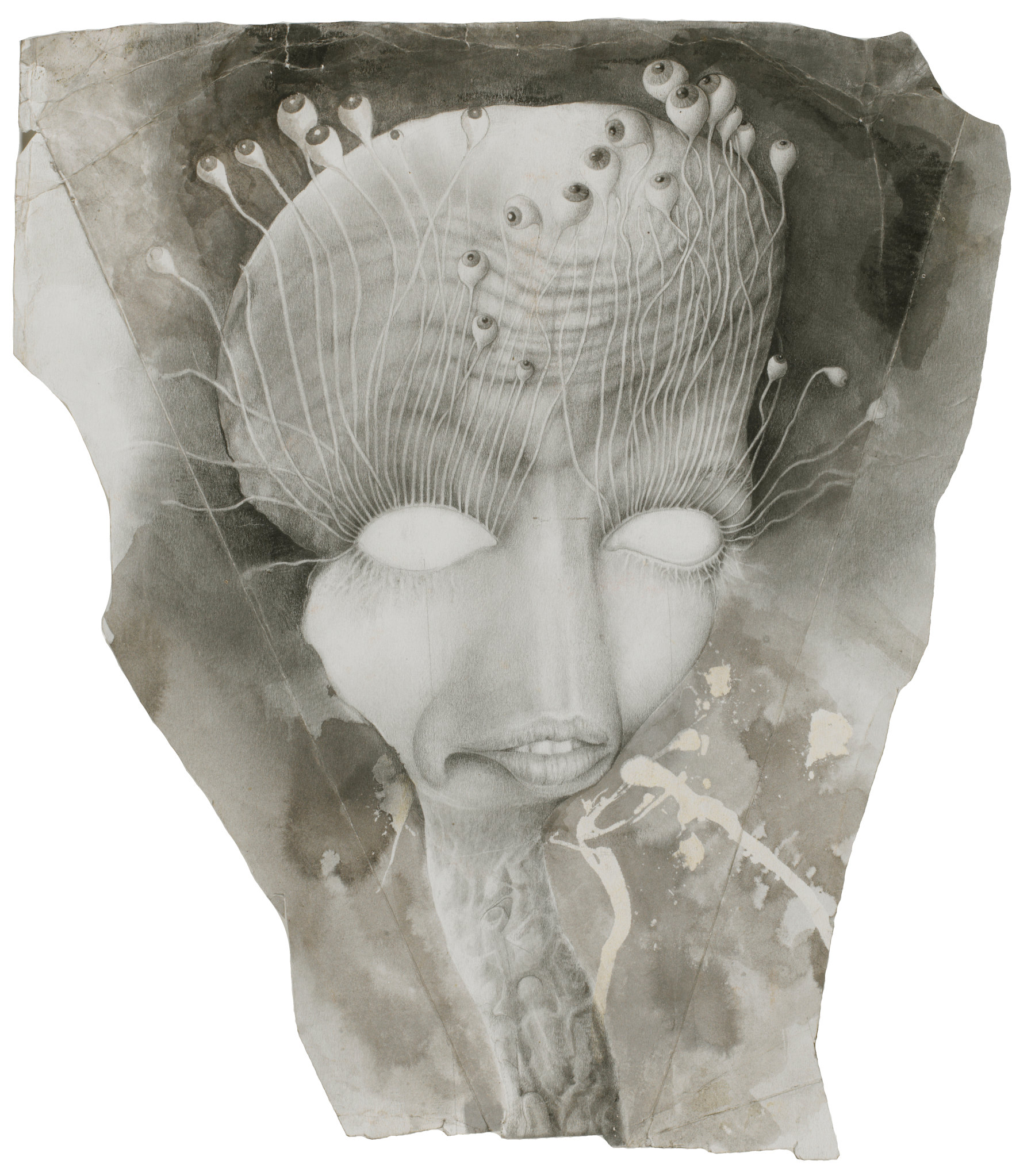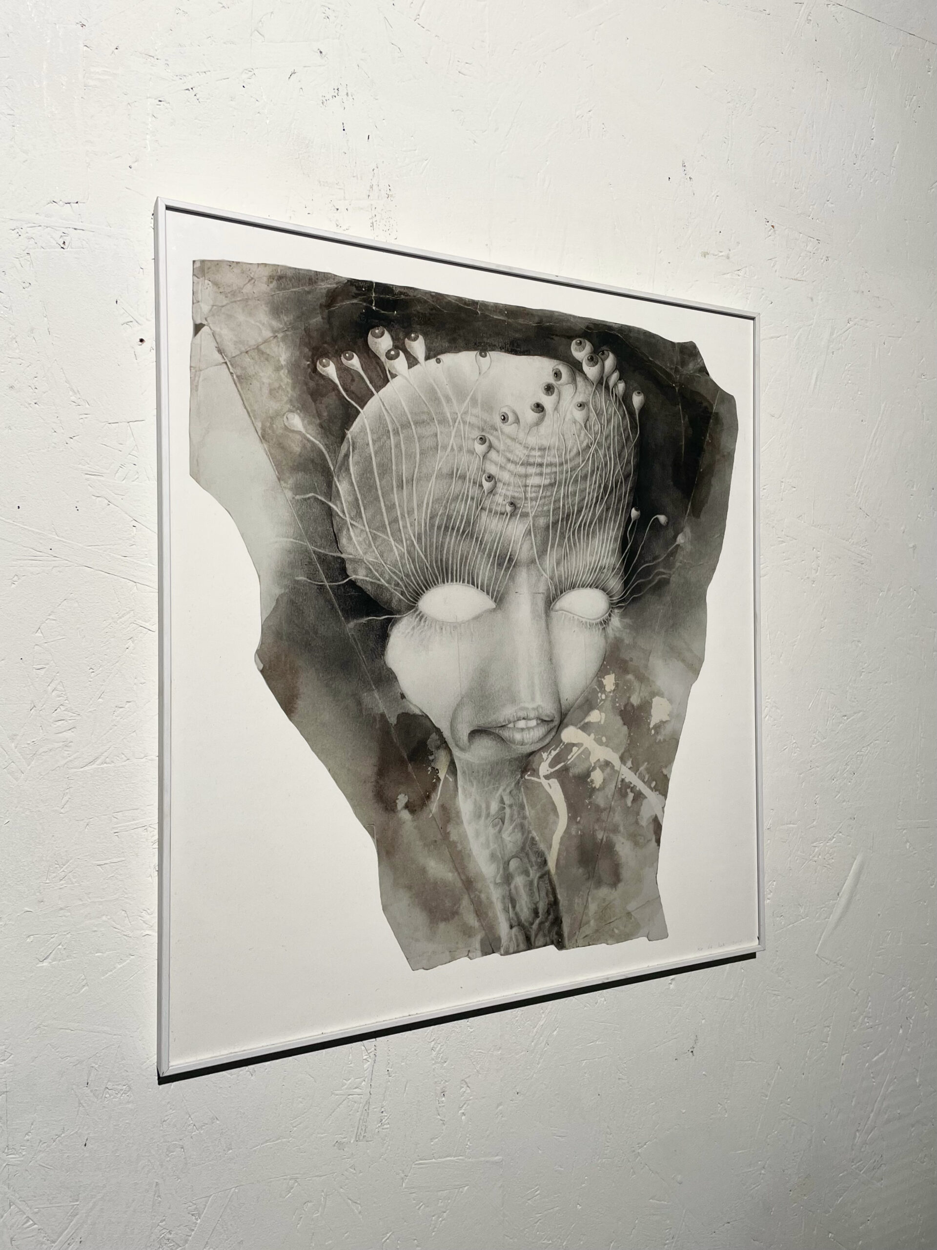 Vlak na de geboorte van dit intrigerende surrealsitische wezen, groeiden zijn wimperharen uit tot oogballen; voelsprieten waarmee hij rondkijkt in een parallel universum. Zijn mond, neus en kin zijn in elkaar gegroeid, wat hemzelf niets kan schelen.