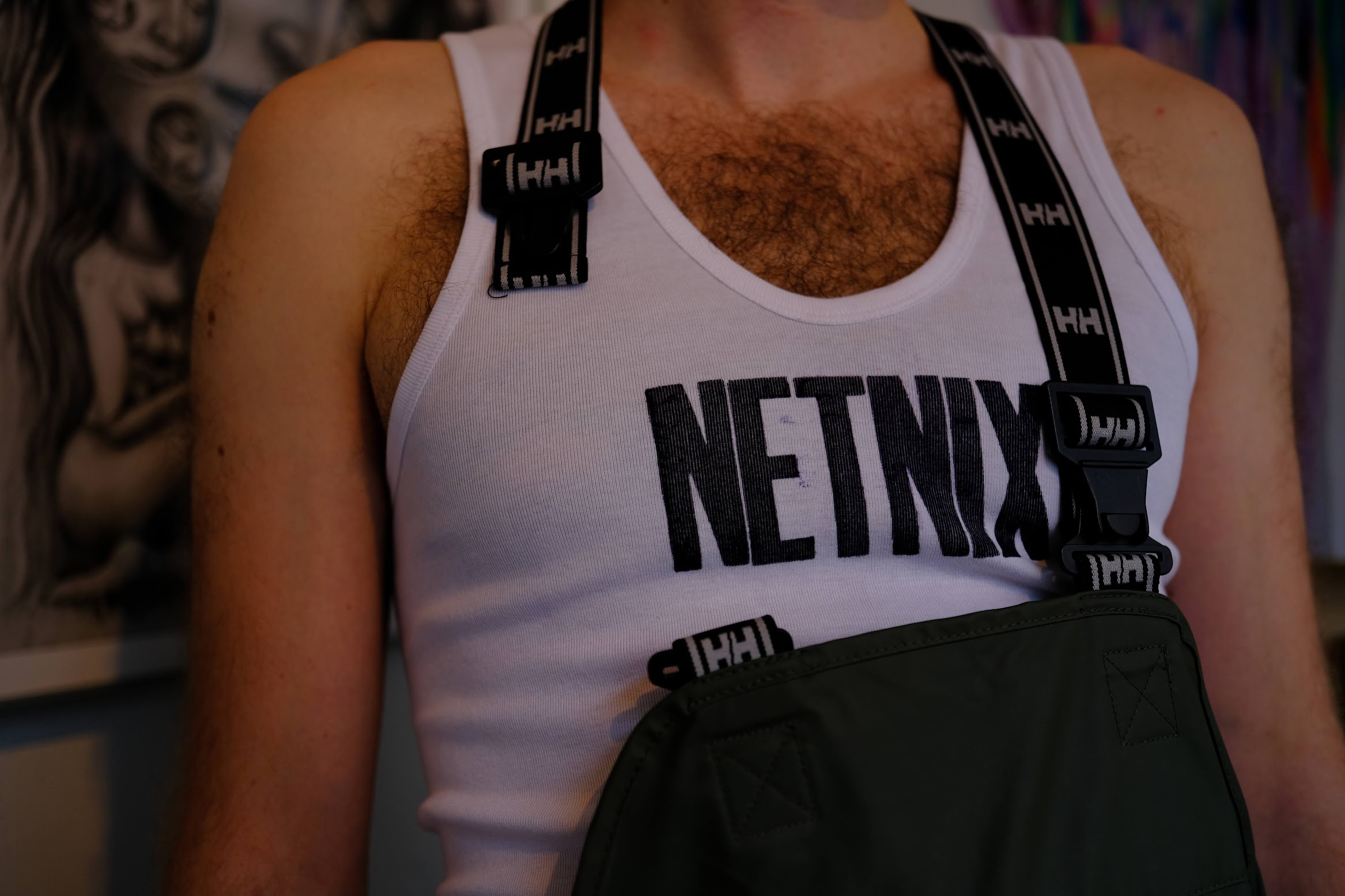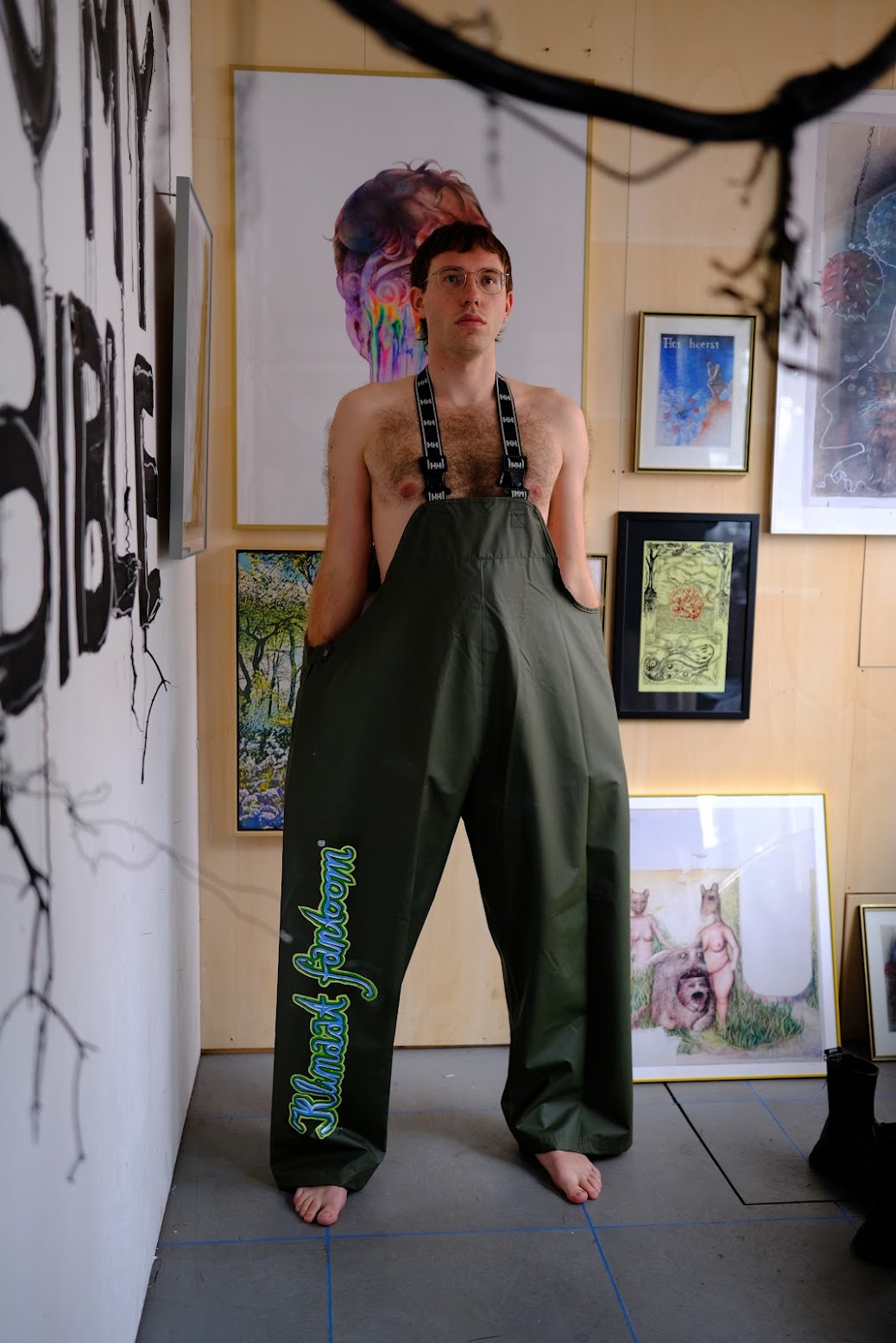 Unieke Klimaat Fantoom broek. Unieke XL tuinbroek om mee door sloten te waden. Olieverf op rubber 2024