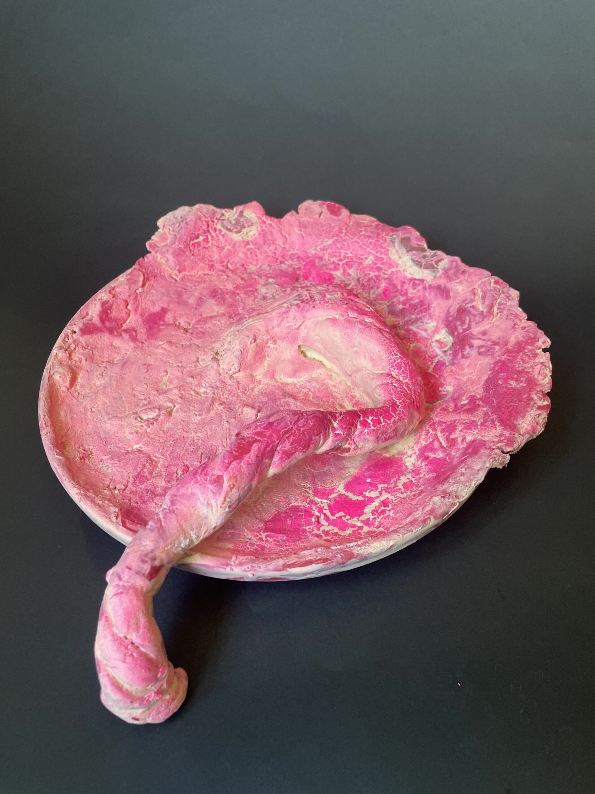 Bord van klei, bewerkt met olieverf en neonkleurige spuitlap en geïnspireerd op de vorm van een placenta.